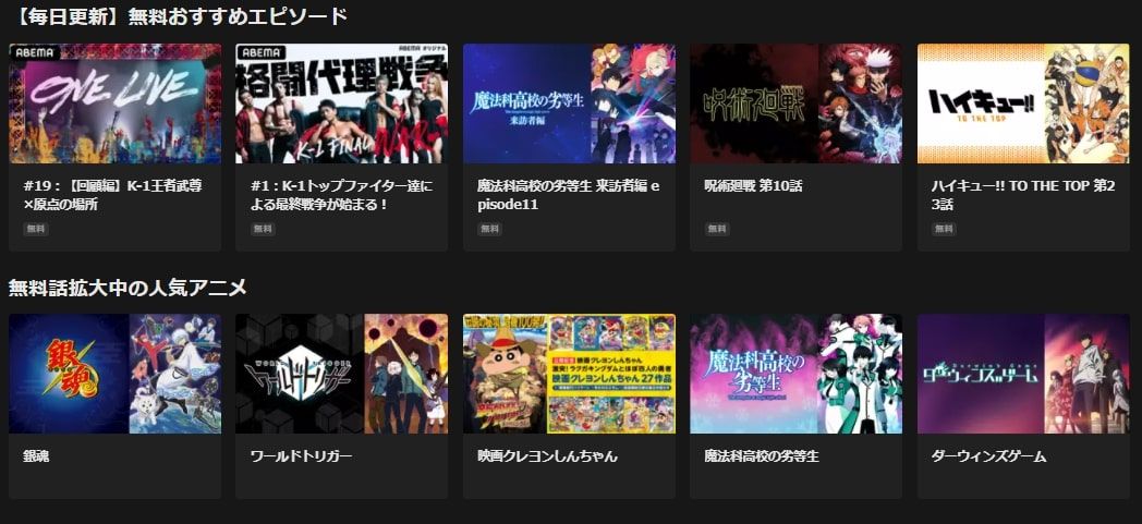 以下の画像にあるように、【無料話拡大中】や【無料おすすめエピソード】などの項目ではアニメやバラエティなどを無料&登録なしで視聴可能です。