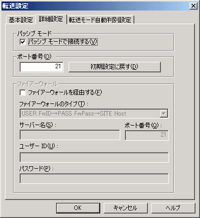 「詳細設定」タブをクリックして「パッシブモードで接続する」にチェックをいれてください。