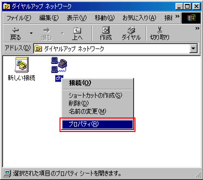 2.利用しているダイヤルアップ接続アイコンを右クリックして「プロパティ」を選択します。 |