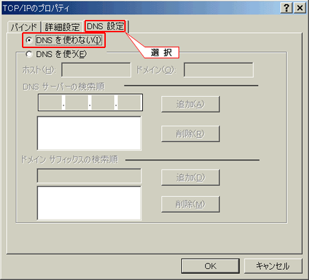 「DNS設定」タブを選択し、「DNSを使わない」にチェックをします。
