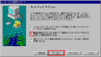 「電話回線またはLANを使って、既存のインターネットアカウントに新しい接続を設定する」を選択し、「次へ」をクリックします。 |