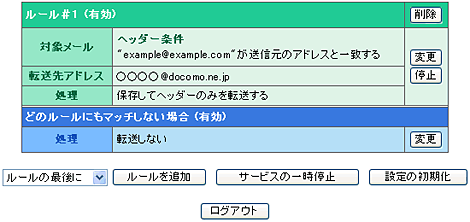 の順番にマッチングが行われます。ルールに合致した場合はその時点でマッチングは終了し、以降のルールのマッチングは行いません。どのルールにも合致しなかったメールは転送されません。