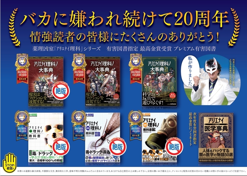 ほかにも「薬理凶室」として出版されたサイエンス本『アリエナイ理科ノ大事典』が有害図書指定を受けていましたね。