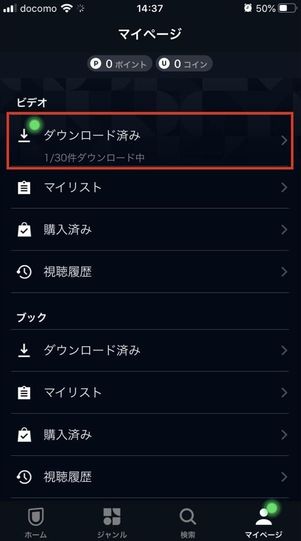 ダウンロードした動画は、マイページの「ダウンロード済み」に入っています。