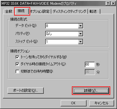 ご利用のモデムまたはTAがエラー制御(V.42,MNP)に対応している場合は、「エラー制御を使う」に、データ圧縮(V.42bis,MNP)に対応している場合は、「データの圧縮」にチェックをし、「OK」を2度クリックします。